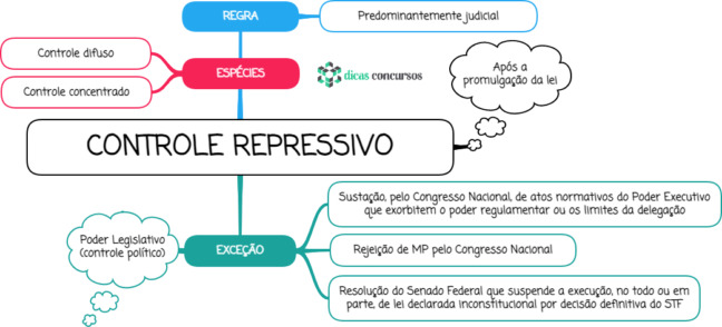 No Brasil, o controle repressivo é confiado ao Poder Judiciário, que o exerce por meio do controle difuso e do controle concentrado. Excepcionalmente, a CRFB/88 admite que o Poder Legislativo retire a efetividade de certas normas infraconstitucionais. São os seguintes casos: